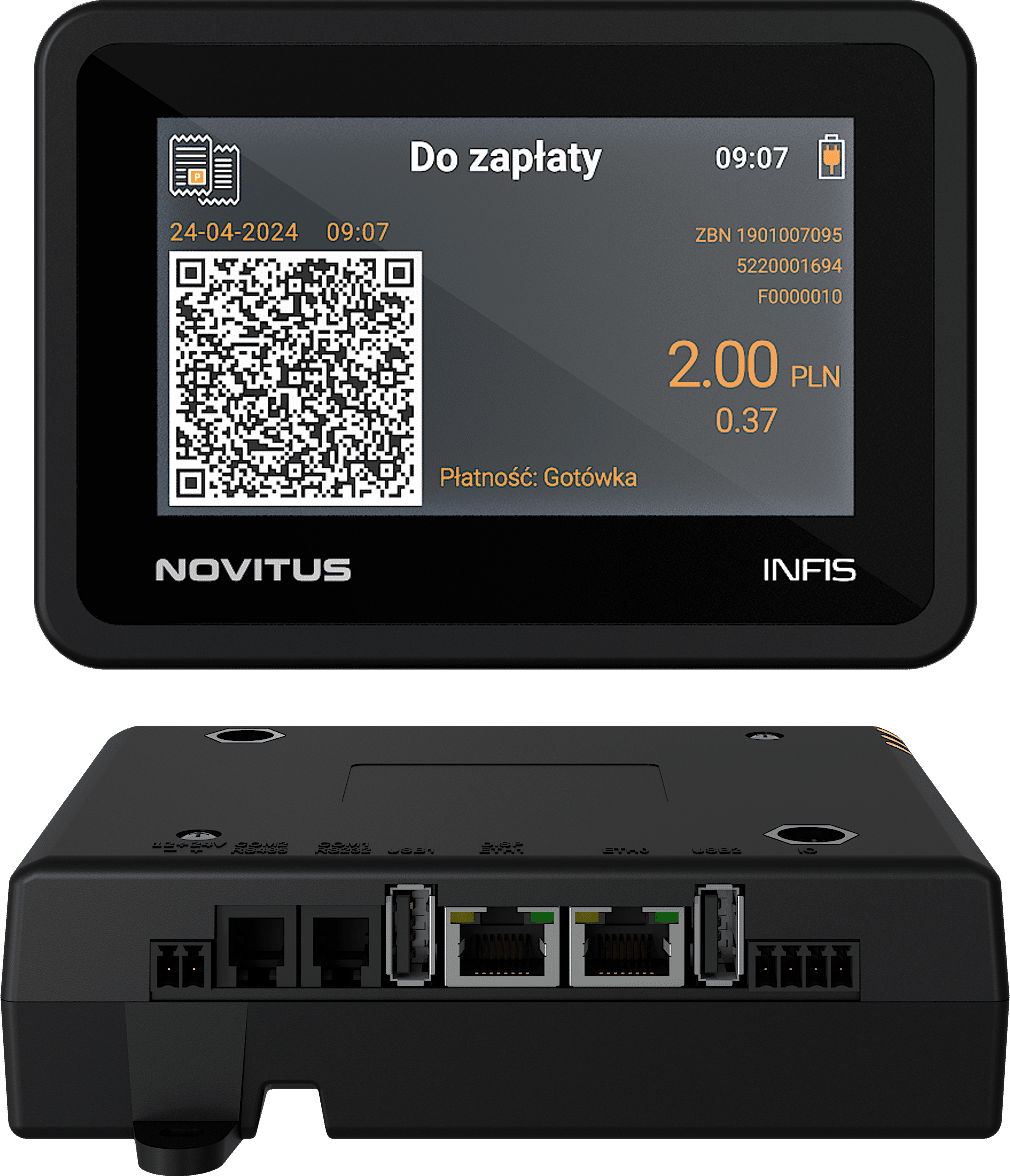 Drukarka fiskalna NOVITUS INFIS jest urządzeniem fiskalnym specjalizowanym, przeznaczonym do montażu w urządzeniach automatycznej sprzedaży towarów i usług dowolnej branży, nie posiada mechanizmu drukującego, gdyż przekazanie paragonu klientowi następuje poprzez wyświetlenie na wyświetlaczu klienta przez 30 sekund zawartości paragonu zgodnej z przepisami dla tego typu urządzeń fiskalnych.